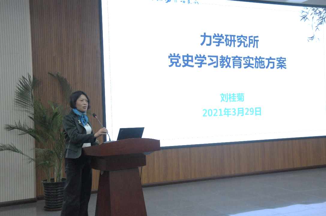 刘桂菊介绍了《力学研究所党史学习教育实施方案》的重点内容以及领导小组和办公室成员名单,对全所开展党史教育学习进行了部署。她强调,要紧扣目标任务,把党史学习教育贯穿全年,突出学党史、悟思想、办实事、开新局,注重融入日常、抓在经常,确保学习教育取得实效;各部门党支部(党总支)书记要高度重视,切实履职尽责,结合实际加强组织领导和推进落实;处级以上领导干部要以更高标准、更高要求开展学习教育;要充分运用专题网站、新闻报道、典型宣传、所党委微信公众号等形式,深入宣传党中央精神和有关部署。