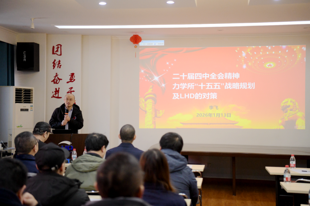 LHD党总支副书记、实验室副主任李飞围绕力学所“十五五”规划思路及实验室应对举措进行了宣贯。首先解读了党的二十届四中全会关于科技自立自强的部署要求,重点阐述了实验室在空天新域新质飞行主攻方向、超低轨长时间飞行等攻关领域的重点任务布局,以及在人工智能融合、高端仪器装备研制等前沿发展方向的布局,强调实验室发展要以成果为导向,加强人才队伍建设与科研成果产出。号召实验室全体党员要深入学习贯彻党的二十届四中全会精神,坚定理想信念、强化责任担当,为我国科技事业贡献力量。