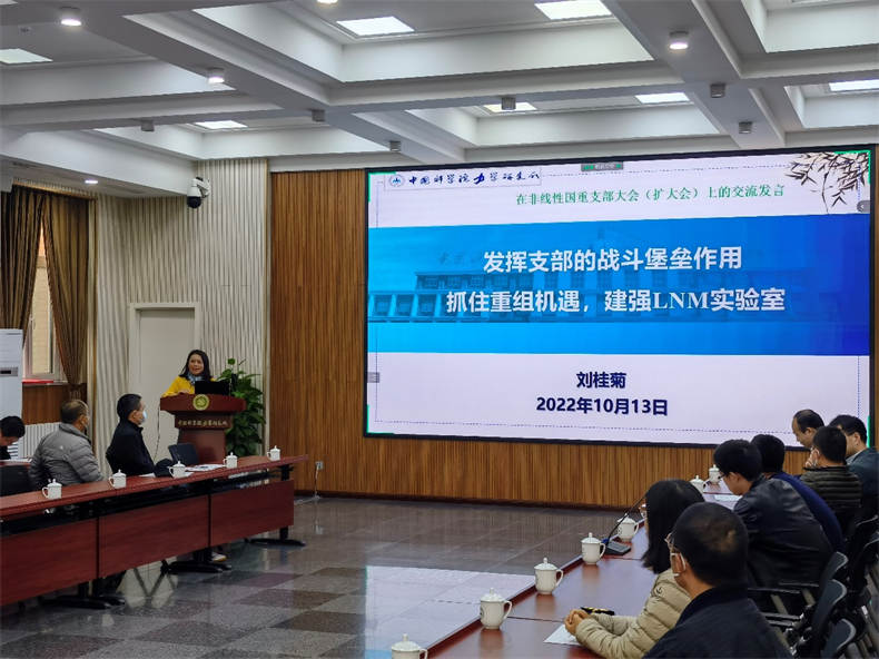 10月13日上午,LNM党支部在1号楼小礼堂召开全体党员大会。党委书记、所长刘桂菊,纪委书记叶海华,党委委员、党群工作处处长武佳丽参加了会议。会议由LNM党支部副书记、实验室副主任袁泉子主持。