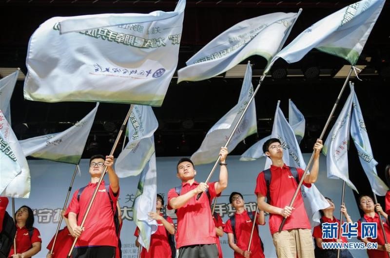 ▲现场授旗仪式,杨明是中科院大学支教团队的旗手