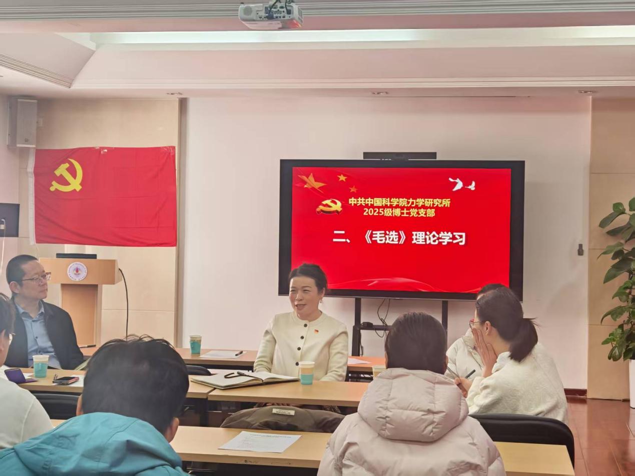 研究生党总支理论宣讲小组成员、支部宣传委员王高洁以《从〈毛选〉看博士生在科研探索中的“破”与“立”》为题作专题报告。报告从《毛泽东选集》中汲取方法论智慧,认为工科博士生科研探索应拒绝经验主义、在扎实调查中找准“破”的方向,勇于走出理论舒适区,在工程实践中检验真知,并把握主要矛盾,实现战略上藐视、战术上重视的统一;表示要将个人科研的“破”与“立”融入国家科技自立自强的使命之中。