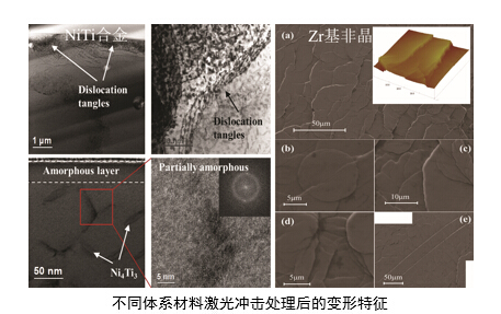 课题组对多种材料的激光冲击强化作用过程和物理机制开展了研究。提出了描述等离子体压力特征的一维耦合分析模型,并发展了等离子体压力的迭代求解方法(Int. J. Impact Eng., 38(5):322-329, 2011)。采用PDV捕捉到了冲击强化过程中金属材料内部的应力波传播和衰减规律,包括弹性前驱波、塑性加载波、弹性卸载波、塑性卸载波、层裂引起的质点速度扰动等特征(J. Appl. Phys., 110(5):053112, 2011)。得到了冲击强化效果的几何相似律,为相关工艺参数优化设计提供了一种可行的分析方法(J. Appl. Phys., 114(4):043105, 2013)。获得了NiTi形状记忆合金在不同应变率、压力条件下的相变与非晶化机制(Mat. Sci. Eng. A-Struct., 578:1-5, 2013)。发现了Zr基非晶经过激光冲击处理后表面出现鱼鳞状的变形形貌(Chinese Phys. Lett., 30(3):036201, 2013)。