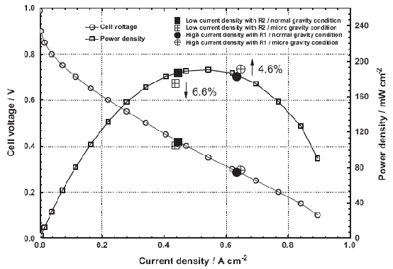 最近,该联合研究团队报道了不同重力条件下PEMFC阴极流道(蛇形单通道,截面积2×2 mm2)内的气液两相流动特征及其对PEMFC电性能的影响,发现与地面常重力环境相比,重力水平的降低导致阴极流道内的水气两相流型发生极大变化,进而直接影响到PEMFC电性能(图1)。实验还发现重力对PEMFC内水气两相流及其电性能的影响与电池运行状态相关:在大电流密度、高产水区,PEMFC阴极流道内由电化学反应生成的液态水在常重力条件下倾向于在垂直向上流道中汇聚,造成流道液泛淹没,阻碍反应物的有效供应及产物的及时排出;而在微重力条件下则倾向于随气流移动,易于排出,从而能有效抑制流道液泛淹没,相应的电性能在微重力条件下比常重力时有4.6%的提高。而在小电流密度、低产水区,微重力条件下分散水滴汇聚会阻塞流道,引起电性能比常重力时降低约6.6%。详见Guo H, Liu X, Zhao JF, Ye F, Ma CF. Experimental study of two-phase flow in a proton exchange membrane fuel cell in short-term microgravity condition. Applied Energy, 2014, 136: 509-518。