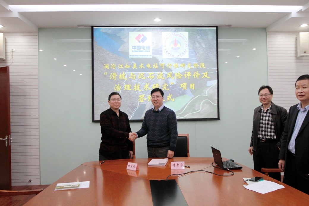“澜沧江如美水电站可研阶段滑坡与泥石流风险评价及治理技术研究”研讨会及项目签约仪式于2014年11月4日在中科院力学研究所举行。会议由中国科学院力学研究所和中国电建集团贵阳勘测设计研究院有限公司(以下简称“贵阳院”)联合主办。出席研讨会的有贵阳院杨家修副院长、范福平副院长兼总工、慕洪友分院副院长兼如美工程设总、李晓彬分院总工,力学所李家春院士、所长特别助理刘青泉研究员、科技处苏建宇副处长、课题负责人吴梦喜高工,以及课题组成员。