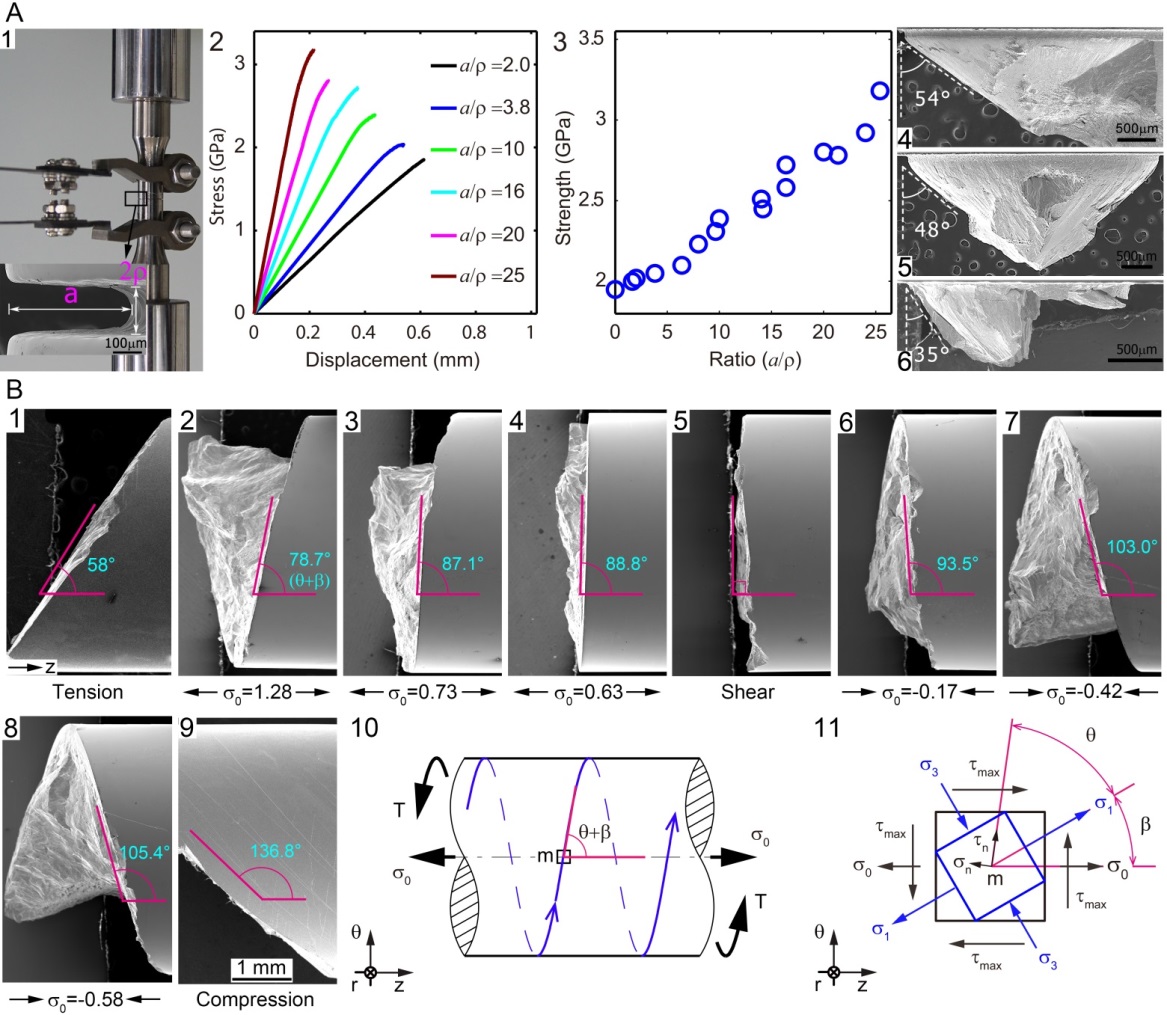 变形模式的转变是导致带缺口的金属玻璃试样强化的原因:通常认为材料中缺口导致应力集中,因此降低有效承载部分材料的强度。实验发现带环向缺口的金属玻璃试样拉伸断裂强度随着缺口加深而增加。同时从理论上发现这一异常强化源自其断裂机制由Mode II剪切破坏向Mode I最大拉应力控制的断裂,见图一A。Sci. Rep. 5, 10537; doi: 10.1038/srep10537 (2015)。