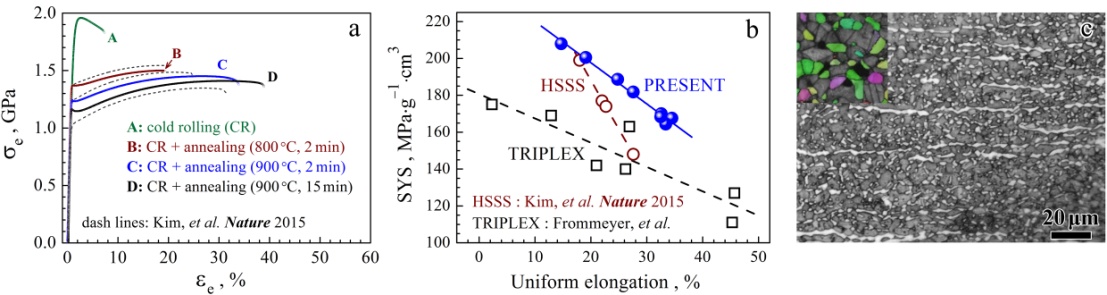 图1 高比强度钢的力学性能和微结构。(a) 冷轧后不同热处理状态下的工程应力应变曲线 (其中Kim教授发表在Nature, 2015上的结果用虚线表示来作为比较)。 (b) 比强度vs. 均匀延伸率。 (c) 高比强度钢的金相照片(其中白色表示层片状或者颗粒状的B2相);插图为电子背向散射衍射图像(其中标有彩色的为B2相)。