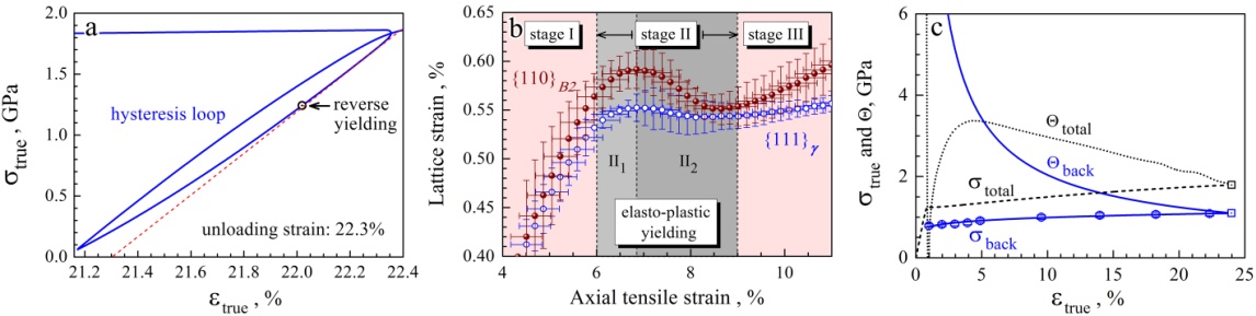 图2 高比强度钢的塑性响应和加工硬化。(a) 拉伸加载-卸载-再加载测试中的类似包辛格效应迟滞环(卸载应变22.3%);反向压缩屈服应力由黑色圆圈指出。(b) 原位X-ray衍射测试得到的γ和B2相中拉伸方向的晶格应变随施加应变的变化规律;其中第一到第三阶段分别代表弹性变形、弹塑性屈服以及共变形阶段。(c) 背应力以及背应力硬化率vs. 真应变;总流动应力和总硬化率随真应变的演化规律同样展示作为比较。