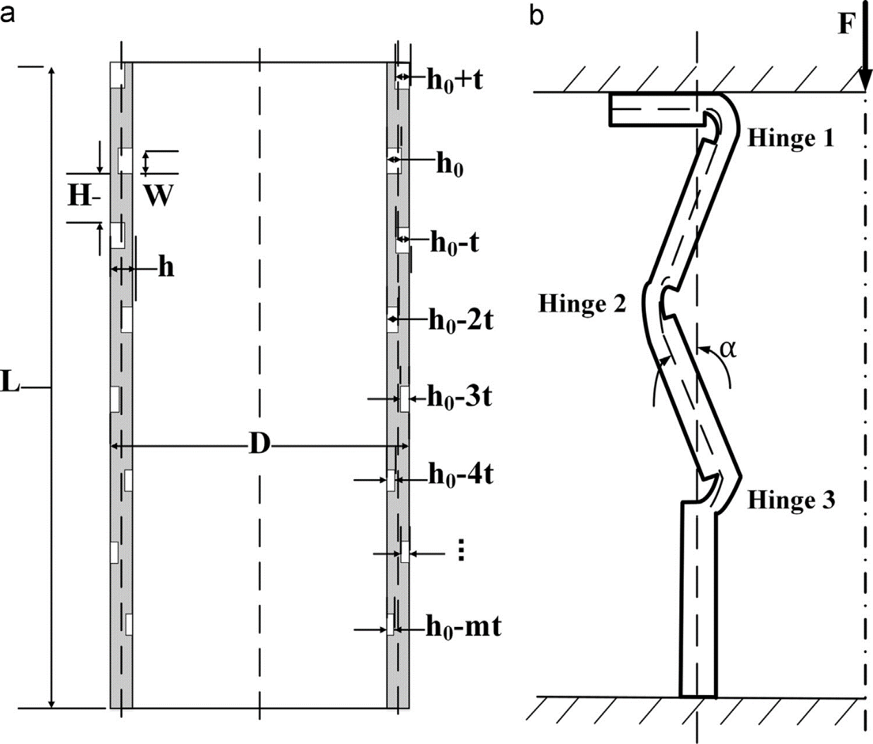 图1 a)梯度环形凹槽缺陷布置示意图b)梯度缺陷筒的褶皱屈曲模型