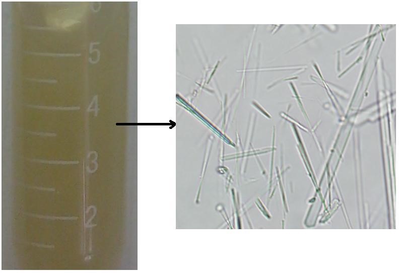 实验室制备的10ml级纳豆激酶晶体溶液(左图)和纳豆激酶晶体照片(右图)