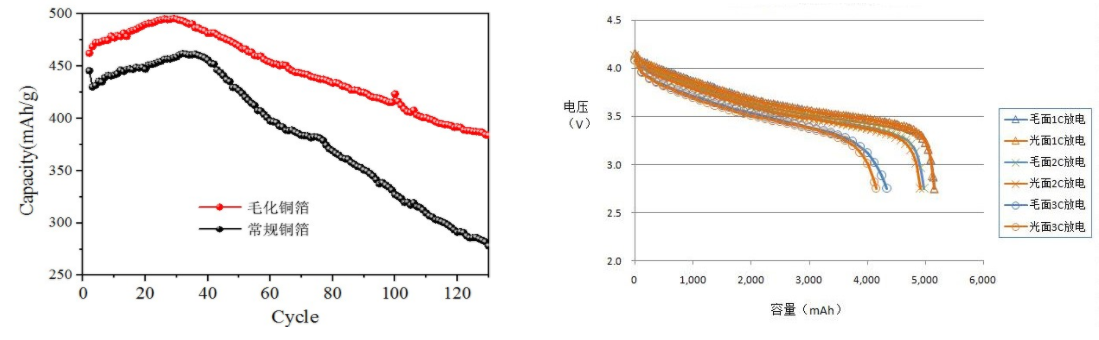 毛化集流体铜箔+硅碳负极材料,半电池扣电,0.5C放电循环130周,容量保持率提高32%。