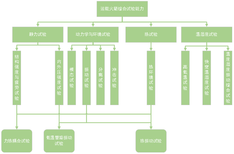 液体火箭基础试验能力包括静力试验、动力学与环境试验、热试验和温湿度试验。集力学加载系统、配电系统、控制系统和数据采集等系统的综合试验能力建设,覆盖强度试验、模态试验、振动试验、冲击试验、热试验和多物理场耦合试验。