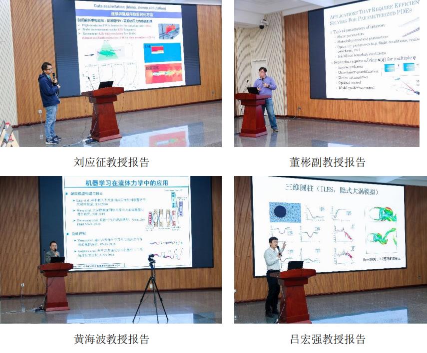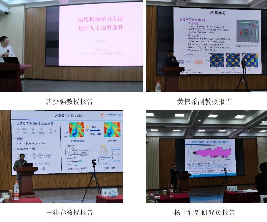 会议以人工智能模拟方法及其在复杂系统力学中的建模与控制、重要工程领域的应用为主题。来自北京大学、清华大学、中国科学技术大学、上海交通大学、北京航空航天大学、南京航空航天大学、南方科技大学、哈尔滨工业大学(深圳)、大连理工大学、中国科学院物理研究所、中国科学院力学研究所、北京计算科学研究中心等著名高校和研究机构的近 20 位专家学者就最新的工作进展作学术报告。报告内容涉及人工智能湍流建模、湍流减阻控制、湍流实验数据同化、流体输运性质和控制方程以及固体材料本构关系构建、参数化偏微分方程的求解、数值边界条件设计、以及在国家重大工程问题中的应用,包括高速铁路疲劳寿命周期载荷谱预测,风电场发电预测等。