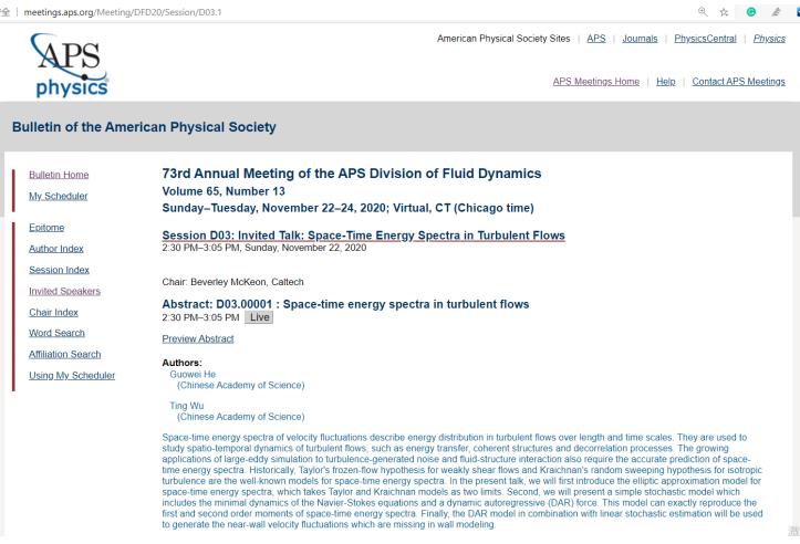 2020 年 11 月 22 日,中国科学院力学研究所何国威研究员应邀在美国物理学会第 73 届流体力学年会作题为“湍流的时空能谱”的邀请报告。何国威研究员系统介绍了湍流时空能谱的 EA 模型及其最新研究进展。课题组发展的动态自回归动力学模型可以能准确地再现时空能谱的一阶和二阶矩,DAR 模型与线性随机估计相结合,可产生壁面模型中缺少的近壁面湍流脉动速度。