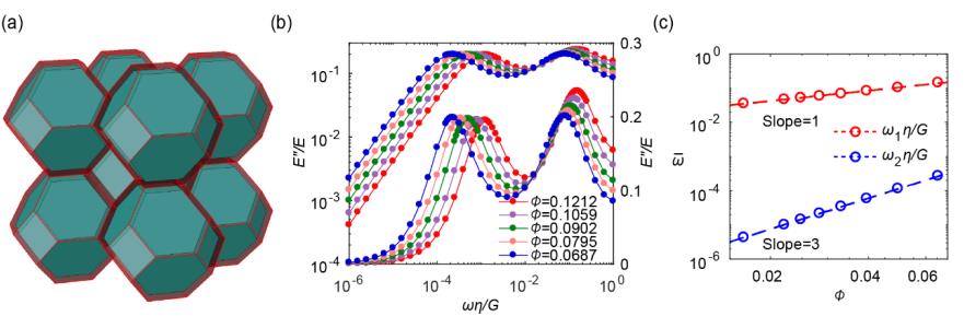 图 4: 三维多晶的内耗峰尺寸效应:(a) Wigner-Seitz 模型; (b) 不同晶界体积分数 ?? 的多晶体的损耗模量频率谱:这里高频峰对应于图 3(c)中的“葛式峰”,由晶界的粘滞性滑动引起,而低频峰则是新发现的耗散峰,由晶界的法向弛豫引起; (c) 两个峰对应的临界频率值与晶界体积分数 ?? 的关系,注意晶界体积分数 ?? 与晶粒寸尺 ?? 成反比,即 ?? ∝ ???1,因此低频峰临界频率正比于 ???3,,高频峰临界频率正比于 ???1,。