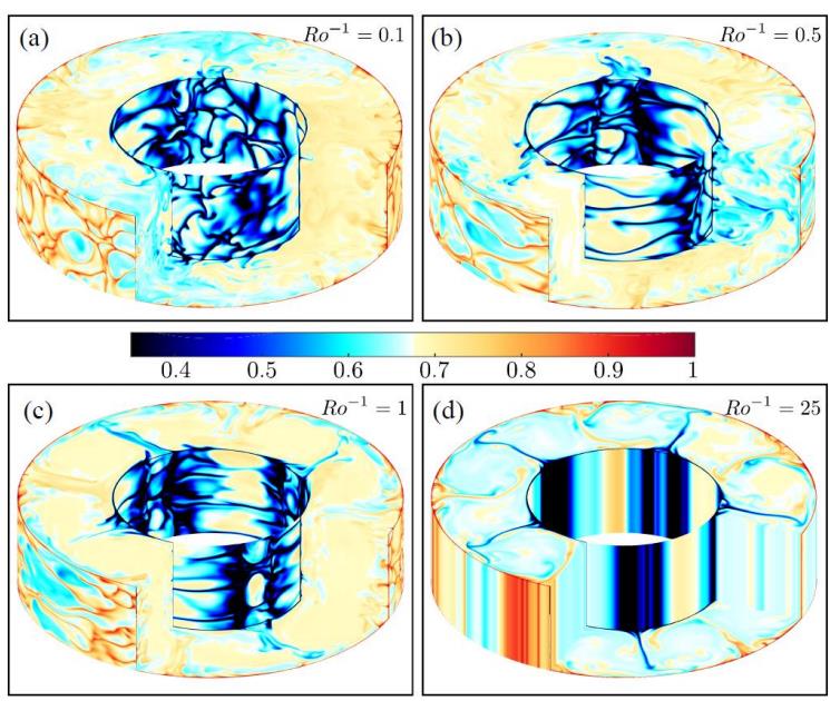 图 10.(a-d)湍流流动结构随旋转效应的增大逐渐的演化规律。