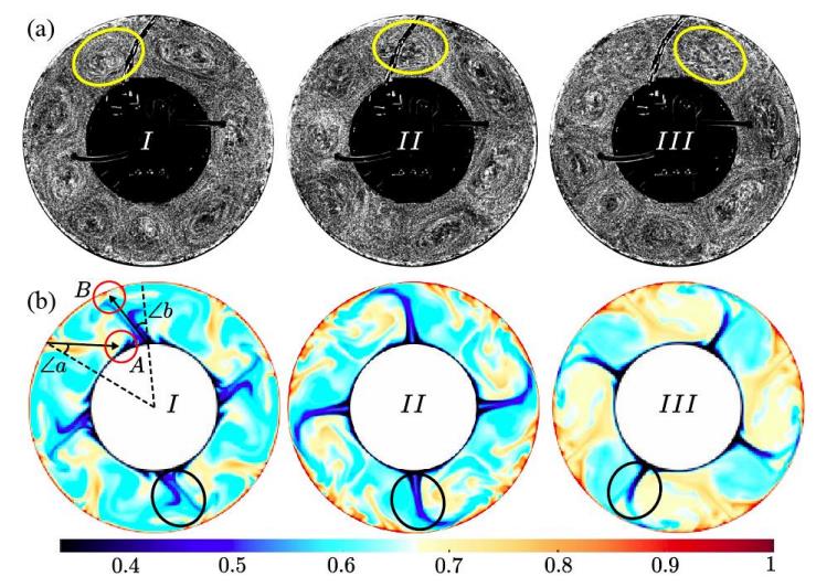 图 11. (a) 条纹图(实验)显示 Zonal flow 流动结构;(b) 瞬时温度场(数值计算)揭示Zonal flow 产生机理。