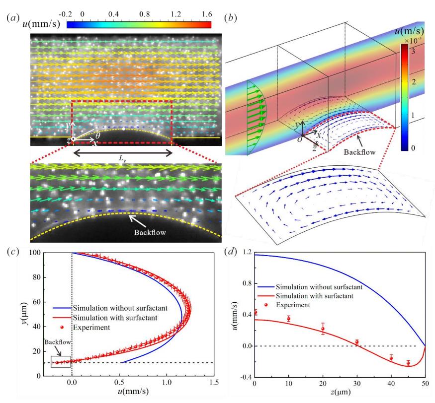 图12. 气液界面上的回流现象:(a)使用micro-PIV测量得到的具有活性剂吸附的速度场,(b)具有活性剂吸附三维流动的数值模拟结果,(c)气液界面顶点沿着y方向的局部速度剖面,(d)气液界面顶点沿着气液界面顶线的滑移速度分布。
