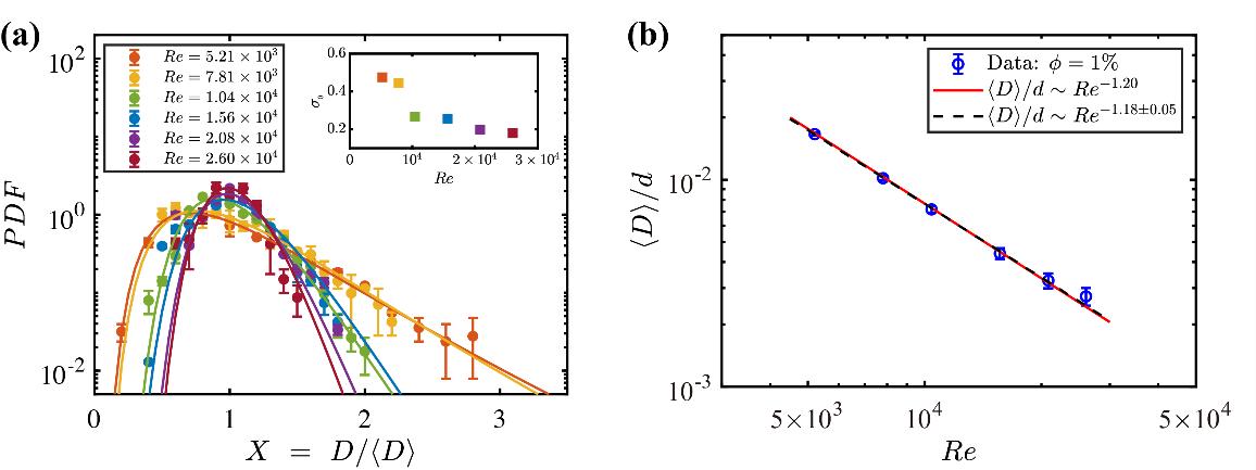 在该研究中,易磊等人通过利用一套Taylor-Couette剪切湍流装置,构建了稳定的油-乙醇水两相混合湍流体系,其中油相体积分数不高于40%。在1%的低油相体积分数情况下,易磊等人通过高速摄像技术捕捉了湍流状态下的分散液滴,并利用图像处理技术对分散液滴的直径进行了统计分析。如图5(a)所示,在不同的雷诺数下,体系中液滴无量纲尺寸的概率密度分布可以通过对数正态分布函数来很好的描述,并且随着雷诺数的增加,分布的宽度逐渐变窄窄(对应于分布函数标准差σ0减小)。这些结果表明,油水两相湍流体系中分散液滴的形成是由典型的破碎过程所主导的。