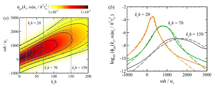 图1. 壁面压力时空谱的DNS结果(实线)与随机下扫模型(虚线)的对比:(a)流向波数-频率时空谱;(b)流向波数为的截面对比。