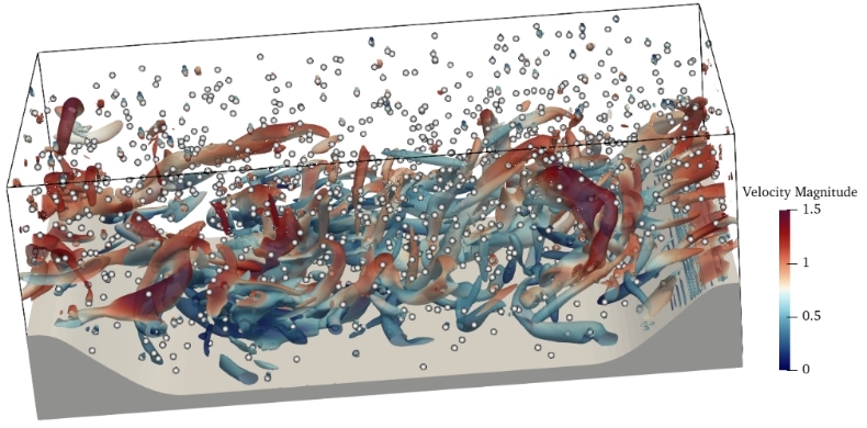 针对工程实际中的颗粒两相湍流往往伴随复杂几何边界的问题,中国科学院力学研究所何国威研究员科研团队开发了一种结合光滑和清晰界面浸没边界方法的计算框架。与此前的方法相比,所提出的框架具有以下两个方面的优势:1)基于曲线网格的清晰界面浸没边界方法可轻松处理任意复杂的环境边界,这对于贴体网格方法来说较为困难甚至不能实现;2) 光滑界面的直接力浸没边界方法用于解析颗粒几何,可准确有效地模拟颗粒输运导致的运动边界,避免贴体网格方法的复杂动网格技术和清晰界面浸没边界方法模拟动边界问题时常出现的力的非物理性振荡。该方法可有效模拟复杂边界下的颗粒负载型流动。目前,该方法已成功应用于周期山颗粒湍流的颗粒解析模拟(图9)。