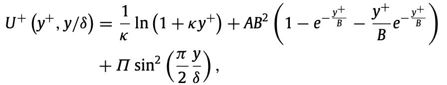 其中卡门常数 κ = 0.4,A = 0.314, B = 4.775,Π = 0.793 。与通常基于阻尼函数的近壁模化方法不同,我们通过引入修正项弥补混合长模型与实际雷诺剪应力的差异,推导了以上表达式。与经典流动的直接数值模拟和实验数据对比显示该公式可以准确捕捉不同壁法向位置的流向速度(图4)。