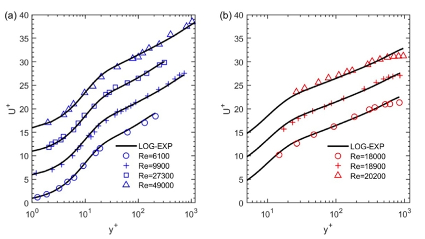 完全解析近壁小尺度湍流结构的大涡模拟和直接数值模拟,计算量高,难以应用于自然界和工程实际中的高雷诺数壁湍流。采用模型模化而非直接解析近壁小尺度湍流是一种广泛采用的替代方案。壁面律是一种常用的壁模型,其通常由两部分组成,适用于黏性子区的线性律和适用于对数区的对数律,但在线性律和对数律转换的区域,模型精度低。针对以上问题,中国科学院力学所何国威研究员科研团队提出了适用不同壁法向位置的单一公式壁面律,LOG-EXP公式: