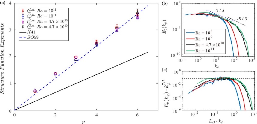 图8:(a)和,径向速度的结构函数指数与尺度的标度律指数对阶数的依赖关系,与BO59标度律相符,与K41标度律偏差较大;(b)温度能谱与周向波数的依赖关系;(c)通过BO59标度律归一化后的周向温度能谱与Bolgiano尺度归一化后的波数的依赖关系。