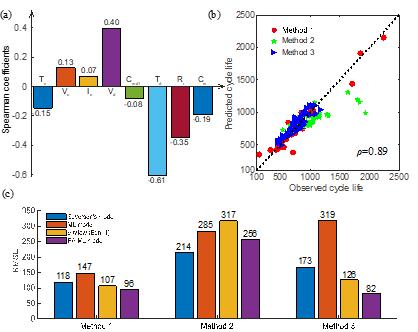商用锂电池显著的个体性能差异是影响锂电池寿命评估的另一个挑战,这是由于锂电池退化性能涉及到多物理场和跨尺度作用下多种失效机制交织影响。本研究利用机器学习方法从商用锂电池首圈的充放电测试数据中提取影响电池寿命的因素,构建了商用电池个体差异的定量评价模型。结合c-N准则,建立了一种物理增强的机器学习模型(PA-ML model)。该模型实现了基于商用锂电池首圈的充放电测试数据即可实现对电池循环寿命的高精度预测,预测精度达到甚至超过其它依赖于上百圈测试信息的寿命预测模型(图14)。
