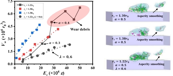 Archard磨损定律广泛用于量化材料的磨损,是由凹凸不平模型推导出来的。然而,扁平化模型是如此理想化,以至于它不能正确地代表一般互锁非晶的真实情况,在这种情况下,非晶的犁状磨损而不是剪切扁平的非晶。中国科学院力学研究所魏宇杰研究员团队刘小明研究员利用分子动力学模拟,讨论了Archard定律在互锁界面的犁式磨损中是否能够成立(图18)。结果表明,当断裂在磨损中占主导地位时,Archard定律会被打破。增加界面附着力或降低材料的延展性会使主导的磨损因素从塑性变为断裂。提出了一个标准来确定Archard磨损定律何时会被打破,并讨论了所提出的真实材料的标准。提出了Archard定律失效的临界点尺寸;证明当交错的粗糙面的耕作被断裂的碎片所控制时,Archard定律失效;同时,强烈的粘附性促进了磨损碎片的形成,从而将使Archard磨损定律失效。该研究成果发表在《Tribol. Int.》。中科院力学所研究员刘小明为该论文(共同)通讯作者。