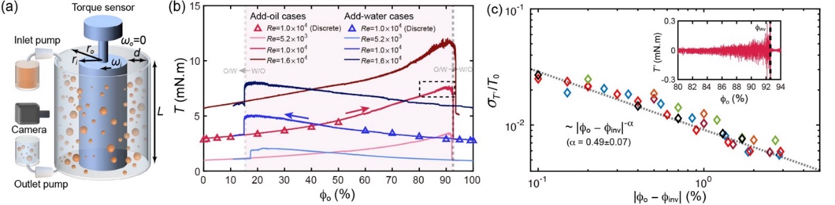图1. (a) 实验装置示意图。(b)油水两相湍流的相反转过程。(c)相反转过程中扭矩脉动量的临界发散行为。