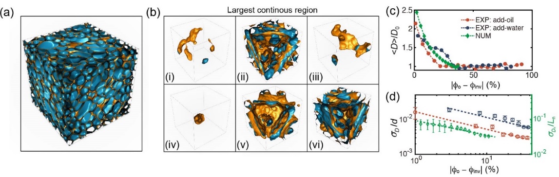 图2. (a)三维全分辨数值模拟。(b)微观分散相结构的动态行为。(c-d)实验与数值模拟中分散相结构特征尺寸的临界发散特征。