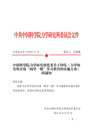 4月27日,根据中共中央办公厅《关于在全体党员中开展“学党章党规、学系列讲话,做合格党员”学习教育方案》以及院党组、京区党委的有关文件精神,所党委统一部署,制定并下发了我所“两学一做”工作方案。 方案要求坚持把学党章党规、学系列讲话贯穿始终,在自学的基础上,各党支部每季度召开1次全体党员会议,每次围绕一个专题组织学习讨论,要有3位以上党员干部做主题发言,互相交流学习的心得体会。党员所领导要参加所在党支部的学习讨论。每次学习后,各党支部向所党委报送总结材料。要求广大党员联系个人思想和工作实际撰写学习感言,党委对党员干部撰写感言情况进行统计并通报。 方案明确所党委把开展“两学一做”学习教育作为当前一项重大政治任务和今年党建工作的龙头任务,党委委员对所联系党支部加强指导,帮助党支部制定学习教育计划,参加党支部各项活动。党委通过召开中心组(扩大)学习会,组织研究所处级及以上领导干部认真学习,不断提高领导和促进科技创新的能力;学习习总书记视察我院时的重要讲话精神,更好地指导今后的工作。年度民主生活会以“两学一做”为主题,领导班子和领导干部要把自己摆进去,查找存在的问题。在力学所网站开设“两学一做”专栏,宣传交流各党支部开展“两学一做”学习教育的做法和成效,加强舆论引导,营造良好氛围。 目前,各党支部正在陆续开展第二阶段“学党规,严守纪律规矩”的学习。