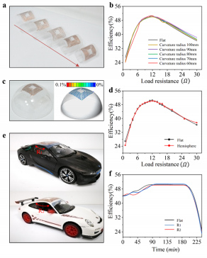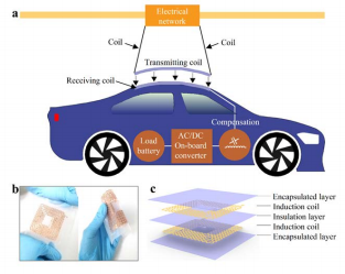 近日,中科院力学所柔性结构与器件力 学课题组提出了一种可伸缩的无线功率传输(SWPT)系统,它由轻薄且可拉伸的电感 耦合线圈组成,整个电路结构设计为蛇形,可以通过伸缩调节为任何型号的汽车充电。 研究团队分别利用 SWPT 系统对两辆不同车 型的车进行无线充电,通过实验验证其充电 效率仍然可以保持稳定。本研究为开发可伸 缩、通用、高性能的无线电能传输系统开辟 了一条新的途径。