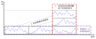 有了时空谱的概念,我们继续介绍什么 是随机下扫模型,这就必须要先介绍另一个 概念,叫做泰勒冻结假设。假如我们想临摹 一幅清明上河图,我们通常会从一头开始, 画完一部分把画纸挪动一下再画下一部分。 可是在实验室里,如果我们想要测量一个很 长的湍流结构,流体不会像清明上河图一样 乖乖地停留在原地等你一点一点地挪动你的 相机,这时我们该怎么办呢?泰勒冻结假设 认为,上游的信号会在之后的某个时刻一成 不变地传到下游, 比如流动速度是 3 米 / 秒, 那么我在 1 秒之后拍到的某一位置的流场和 当前时刻上游 3 米处的流场是一样的,这样 我们只需要在我们的拍照窗口上多拍几张照 片,然后把它们拼起来就可以得到当前时刻 的流场(图 2)。