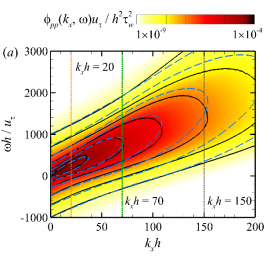 与速度类似,平均运动对流以及大尺度 涡的随机下扫作用是壁面压力时空关联的两 个主要机制。因此,壁面压力时空谱可以采 用随机下扫模型描述,表示为波数谱与高斯 频率分布的乘积。该模型中三个速度尺度分 别取为壁面压力的平均对流速度以及缓冲区 (由于篇幅所限,关于壁湍流分区的理论在 这里不做展开了,缓冲区可以简单地理解为 近壁湍流最活跃的区域)的脉动速度,不含 任何可调参数。图 3 对比了壁面压力时空谱的 DNS 结果与随机下扫模型的结果,证实 了随机下扫模型可以很好地得到壁面压力时 空谱的含能区性质,这里含能区指能量较高 的区域,即图中颜色较深的区域,在这个区 域,随机下扫模型和真实情况(DNS 结果) 符合较好。