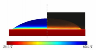 图 1 Ⅰ 型溶解润湿内部的浓度场。图中左边是根据 Fick 定律计算的浓度分布, 右图是实验结果, 液滴中同一高 度的浓度相同