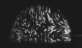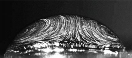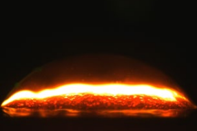 以上就是溶解中全部情况吗?答案是否 定的。在图 4 中基底的材料是焦糖, 液滴底部 暗色区域是高浓度的焦糖, 由于焦糖的颜色太 深, 因此内部的荧光无法被外部的激光激发。 图中发亮的光环是浓度较低的区域, 不发光的 地方浓度为零。这里说明该液滴中, 下半部分 的糖水一样“甜”,上半部分任然是普通的 水。这是怎么回事?表面张力在这里不起作用 了?为什么还是和印象中的扩散不一样呢? 这里的原因在于液滴中存在重力作用,在图 2 中, 基底溶质的密度小于溶剂, 所以浮力可以 抵消一部分重力的影响, 但是在图 4 的案例中 溶质的密度大于溶剂, 因此糖分子会持续聚集 在底部,难以被 Marangoni 对流输运到气液 界面上, 而且液滴中部的补充流也会阻止糖分 子向上输运。从图 6 我们可以看到液滴上下分 布着两个方向相反的对流, 进而将液滴分割为 上下两部分。