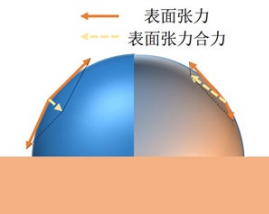 图 4 不同情况下表面张力的作用,左半边是不溶解情况下表 面张力的分布, 其合力指向液滴中心, 左半边是溶解情况下,表面张力分布不均进而产生切向的合力