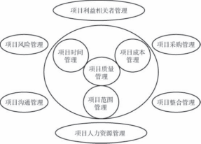 美国项目管理学会(PMI)从不同的管 理职能角度,将现代项目管理知识体系划分为十大知识领域(见图 1) ,包括项目整合 管理、项目范围管理、项目时间管理、项目 成本管理、项目质量管理、项目人力资源管 理、项目沟通管理、项目风险管理、项目采 购管理和项目利益相关者管理。它们是不同 性质、不同规模、不同行业进行项目管理的 通用核心内容,也是推行项目管理、建立项 目管理制度体系的核心内容。其关系见图 2。