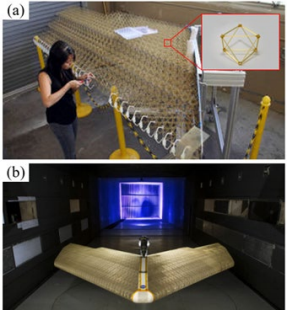 图 6 是美国 NASA 与麻省理工、加州 大学伯克利分校以及圣克鲁兹分校的研究人 员合作设计的超轻可变形无人机,该无人机 机翼由点阵胞元拼装而成,胞元为注塑成型 的碳纤维复合材料,模块化的拼装工艺使得 无人机可以像乐高积木一样被设计和制造, 机翼形状可以自由变换以满足不同的任务需 求,受损部件也便于更换。该无人机通过在 机翼点阵骨架外表面节点上植入相应的传感 器网络,可以对飞行过程的流场信息进行收 集,并通过相应算法处理反馈给无人机来实 现机翼的变形和扭转,从而实现最高效地飞 行。