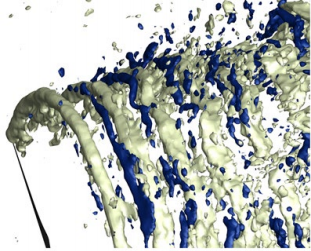 图 1:2.5 MW Clipper 风机的复杂翼尖涡结构。浅色:翼尖涡;深色:二次涡。