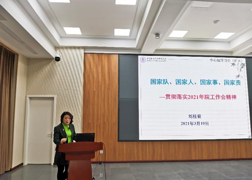 刘桂菊作总结发言,她强调各部门要把学习党中央及上级重要会议文件精神融入日常工作,深刻领会精神实质及内在要求;对照中科院改革创新发展的六方面总体要求,各部门要结合实际工作深入学习思考,直面问题并谋划改革发展,明确战略方向和发展思路;围绕2021 年研究所重点工作,各部门、党支部要安排部署今年工作重点及主要举措,齐心协力以新气象新作为谋求研究所的新发展。