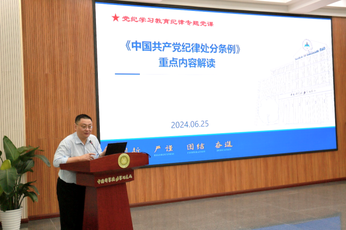 随后,纪委委员仲峰泉带领大家深入学习新修订的《中国共产党纪律处分条例》(以下简称《条例》)。党委委员、党委办公室(纪检审办)主任武佳丽作了《以案为鉴知敬畏,防微杜渐守底线》的典型案例警示教育报告。财务与资产处处长林翳聚焦于科研经费使用,作了《聚焦重点 严守党纪 管好用好科研经费》的专题报告。