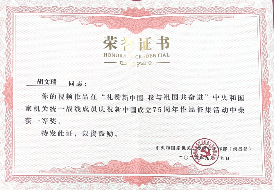 2024年,是中华人民共和国成立75周年,为引导中央和国家机关统一战线成员进一步增强对中国共产党的创新理论的政治认同、思想认同、理论认同、情感认同,激励统一战线成员奋进新征程、建功新时代,聚焦推进中国式现代化凝心聚力,中央和国家机关工委举办了“礼赞新中国我与祖国共奋进”——中央和国家机关统一战线成员庆祝中华人民共和国成立75周年作品征集活动。活动得到中央和国家机关各部门广大统一战线成员积极响应,共征集文字、摄影、视频作品361件。经部门机关推荐、专家评审,选出特等奖25个,一等奖50个,二等奖80个,三等奖110个,优秀作品奖60个。