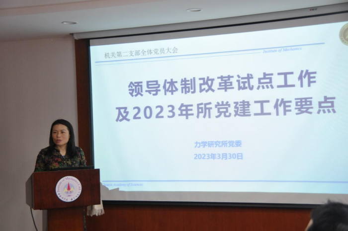 刘桂菊作题为《领导体制改革试点工作及2023年所党建工作要点》的报告,介绍了领导体制改革重要意义、推进情况和下一步工作安排及2023年研究所党建工作要点。她指出,在力学所开展领导体制改革试点工作,是院党组着眼力学所长远发展大局作出的重要决定,是对力学所党建引领科研促进发展各方面工作的高度认可。力学所党委高度重视领导体制改革试点工作,成立了专班,制定了详细的工作计划。她强调,党支部要充分发挥战斗堡垒作用,明确“三个清单”目标任务并且进一步落实到人、细化措施,不断推进党建与科研深度融合;支委和中层领导干部要协同工作,进一步统一党员职工思想认识,着力解决党员职工急难愁盼的问题,充分调动科研人员积极性,进一步释放和激发创新活力,营造勇于创新、严谨求实、团结奋进的力学所文化氛围,为保障力学所高质量快速发展贡献力量。