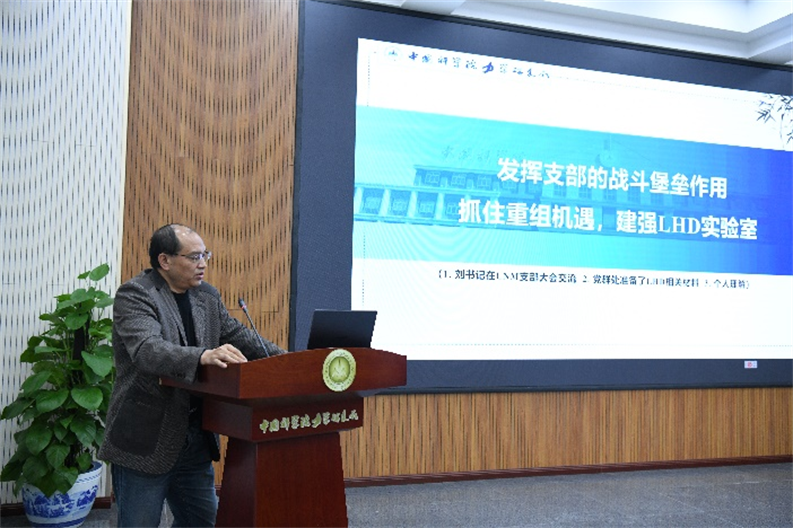 赵伟作了《发挥支部战斗堡垒作用及下一步工作部署》的报告。他报告了LHD党总支发挥战斗堡垒作用的具体内涵,并对下一阶段党总支的党建重点工作进行了部署。号召全体党员加强沟通交流,凝聚思想共识,积极营造良好科研生态环境,大幅提升科技攻关能力,全力保障实验室国重重组工作顺利实施。