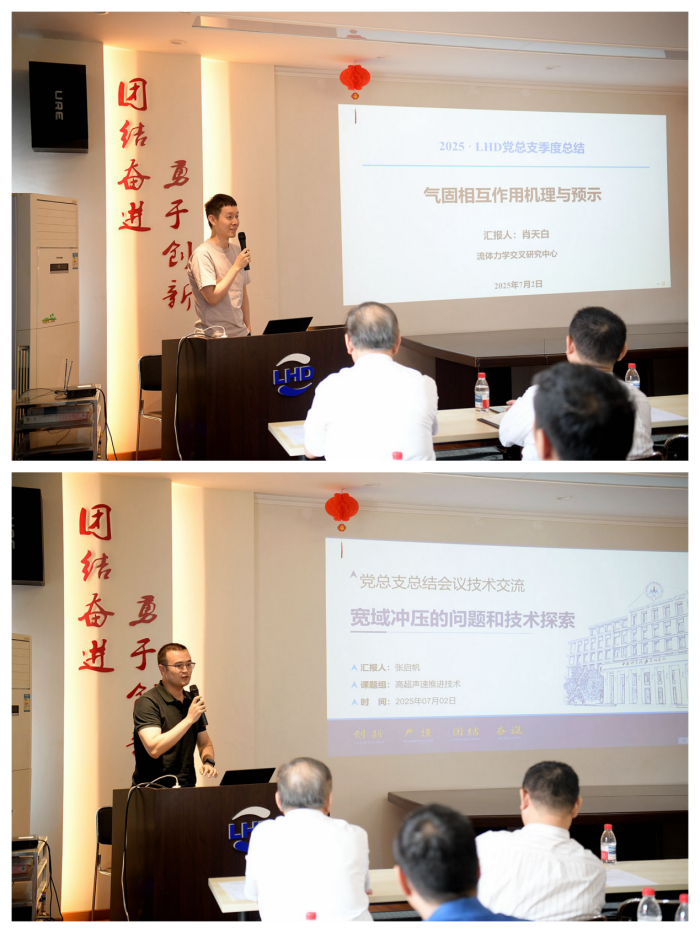 青年科研骨干肖天白作了“气固互相作用机理与预示”的报告。他介绍了在研重大项目的研究背景、研究思路、发展规划以及团队组织的个人体会,分享了团队近期在非平衡流动精细化建模、气固界面分析动力学、介观模拟与实验、流固耦合计算方法等方面取得的进展。随后,青年骨干党员张启帆作了“宽域冲压的问题和技术探索”的报告,介绍了宽域冲压发动机的研制背景,课题组在宽域冲压方面的研究布局,宽域冲压发动机研制的关键问题梳理和技术探索,并针对困难挑战清单,提出了如何破局的科研思路。