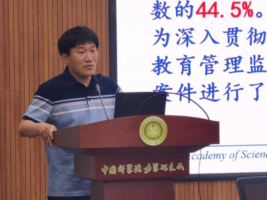 王展宣贯了干部队伍教育整顿工作安排和要求,党总支副书记张旭辉作了题为《警示教育案例分享》的报告,提醒广大党员警示自己,防微杜渐,警钟长鸣,严于律己,知敬畏、存戒惧、守底线,杜绝任何违法乱纪行为的发生。超常环境非线性力学全国重点实验室(筹)副研究员杨丰畅作了题为《中央工委青年干部培训体会》的报告,提醒广大党员干部认真学习习近平总书记重要讲话以及党中央对科技发展的研判,年轻干部要深刻认识新发展阶段的一系列规律和特征,站在全局和战略的高度想问题、办事情,将所思、所学、所悟、所能更好转化为奋进新征程、建功新时代的强大动力,不负殷切期望。质量保密办公室主任刘宏立作了《2023年全所半年保密检查情况通报及保密工作宣贯培训》的报告,强调了接下来保密检查的重要性,提醒大家务必要高度重视。教育处副处长刘丽宣贯了力学所的招生制度,介绍了力学所导师招生制度和研究生指标的现状。