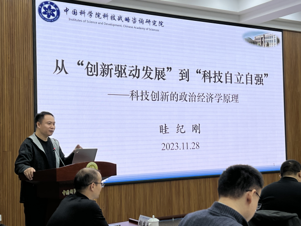 交流讨论会由LMFS党总支书记、实验室主任王展同志主持。战略咨询院创新党支部书记、副所长眭纪刚作了题为《从“创新驱动发展”到“科技自立自强”》的报告,深入解读了党的二十大报告中有关“加快实施创新驱动发展战略”的内容。他介绍了科技发展的国际经验与教训以及中国科技体制改革的历程和成就。结合当前复杂的国际形势和我国面临的科技创新挑战,眭纪刚引出了“为什么我们要追求科技自立自强”以及“如何应对挑战”等问题。