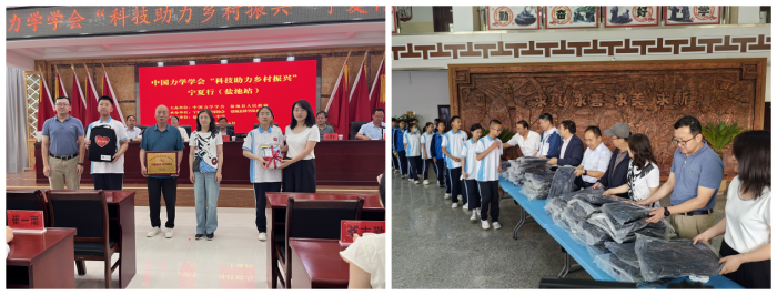 中国力学学会党委委员、力学所学会办公室党支部书记汤亚南与盐池县科协主席范庭山交接了捐赠牌。中国科学院力学研究所微重力实验室党支部书记姜恒研究员和中国力学学会女科技工作者委员会秘书长邵丽华教授为学生代表捐赠了科普图书和学习用品。